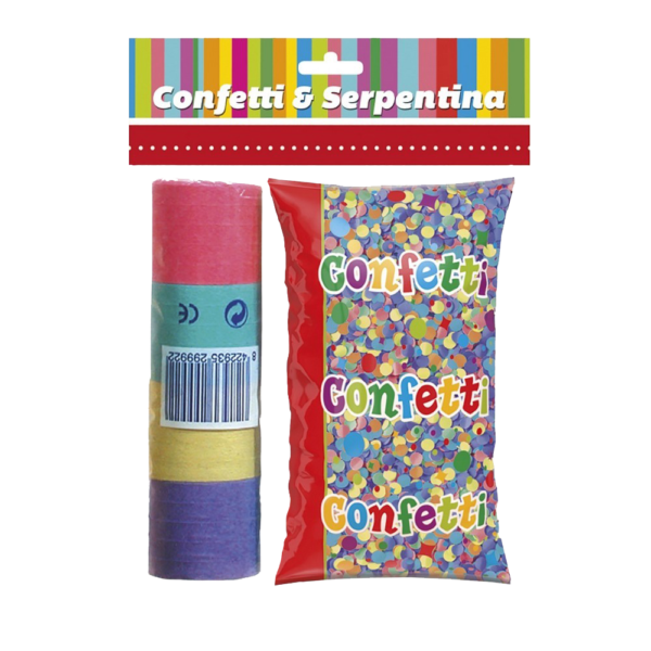 Confettis de papel com cores sortidas em saco de 50gr + 4×5 rolos de Serpentinas